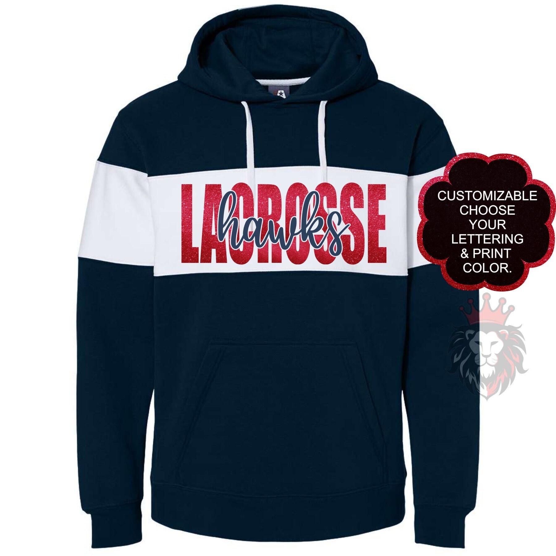 Show off in the stands with custom & personalized Lacrosse color block hoodie. These hoodies are great gifts for Lacrosse teams, Lacrosse coaches, Lacrosse moms, Lacrosse dads, and even yourself! You can customize the lettering & print colors in the personalization section to reflect your favorite team.