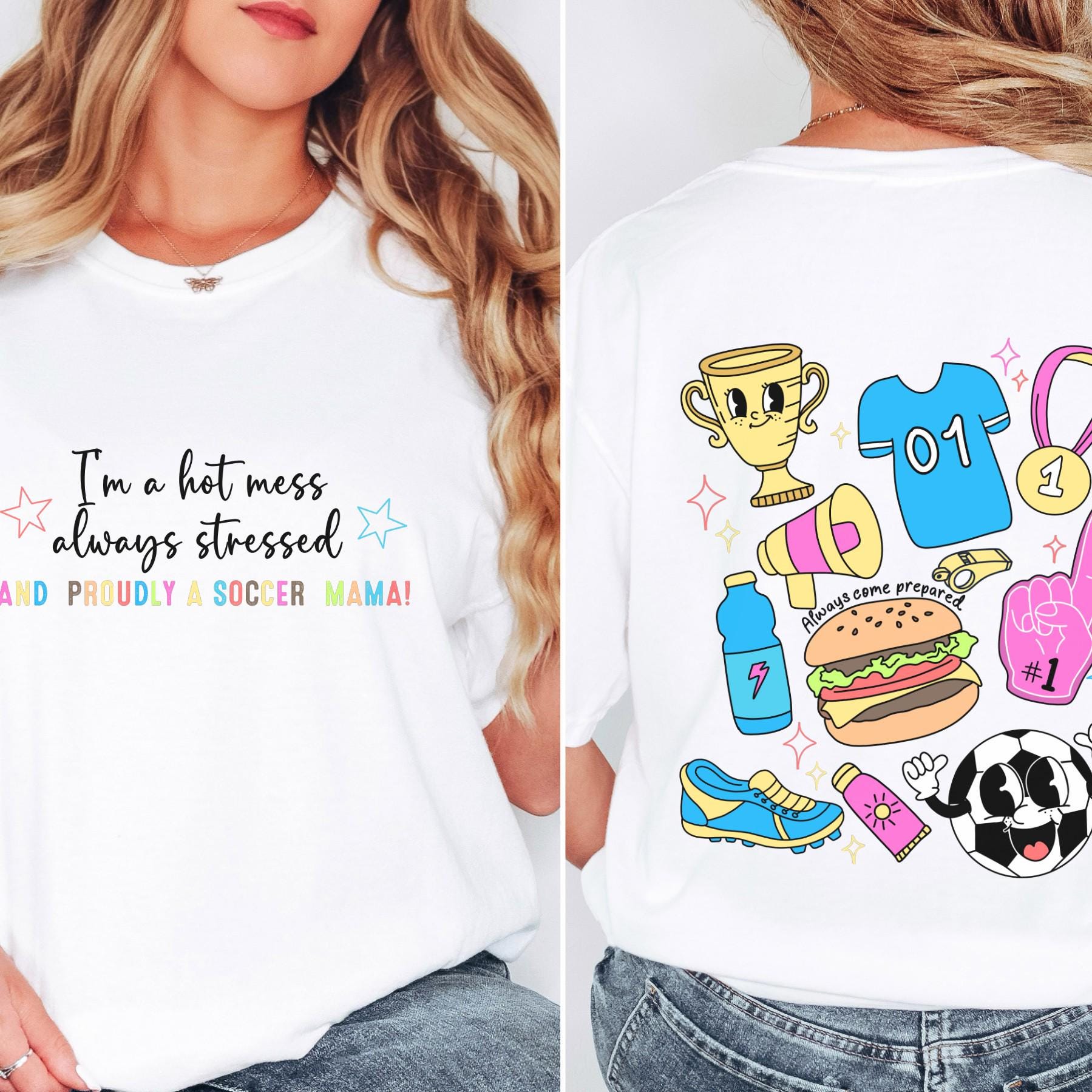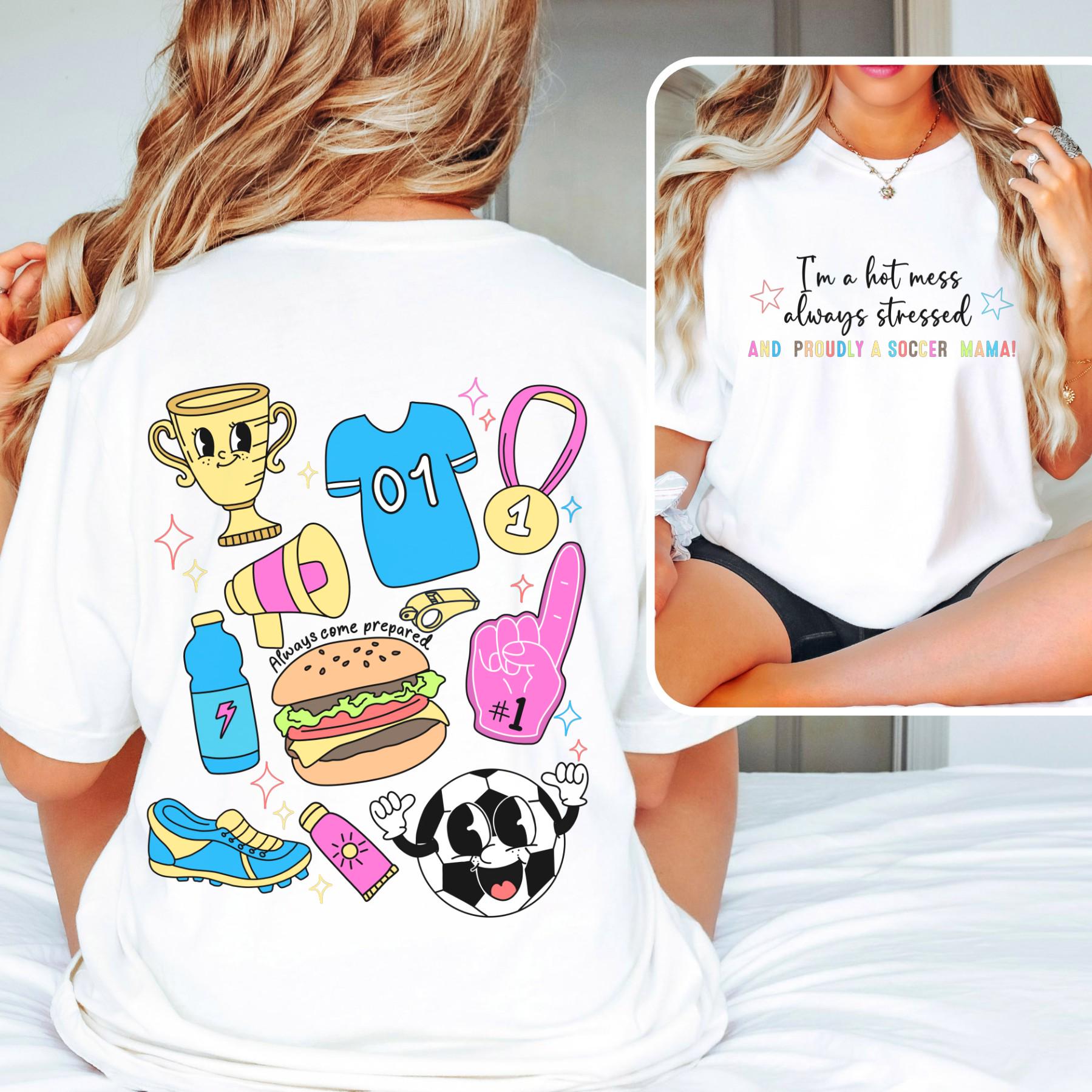 Show your chaotic soccer mom pride with this “I’m a Hot Mess, Always Stressed & Proudly a Soccer Mama!” T-shirt! ⚽💖