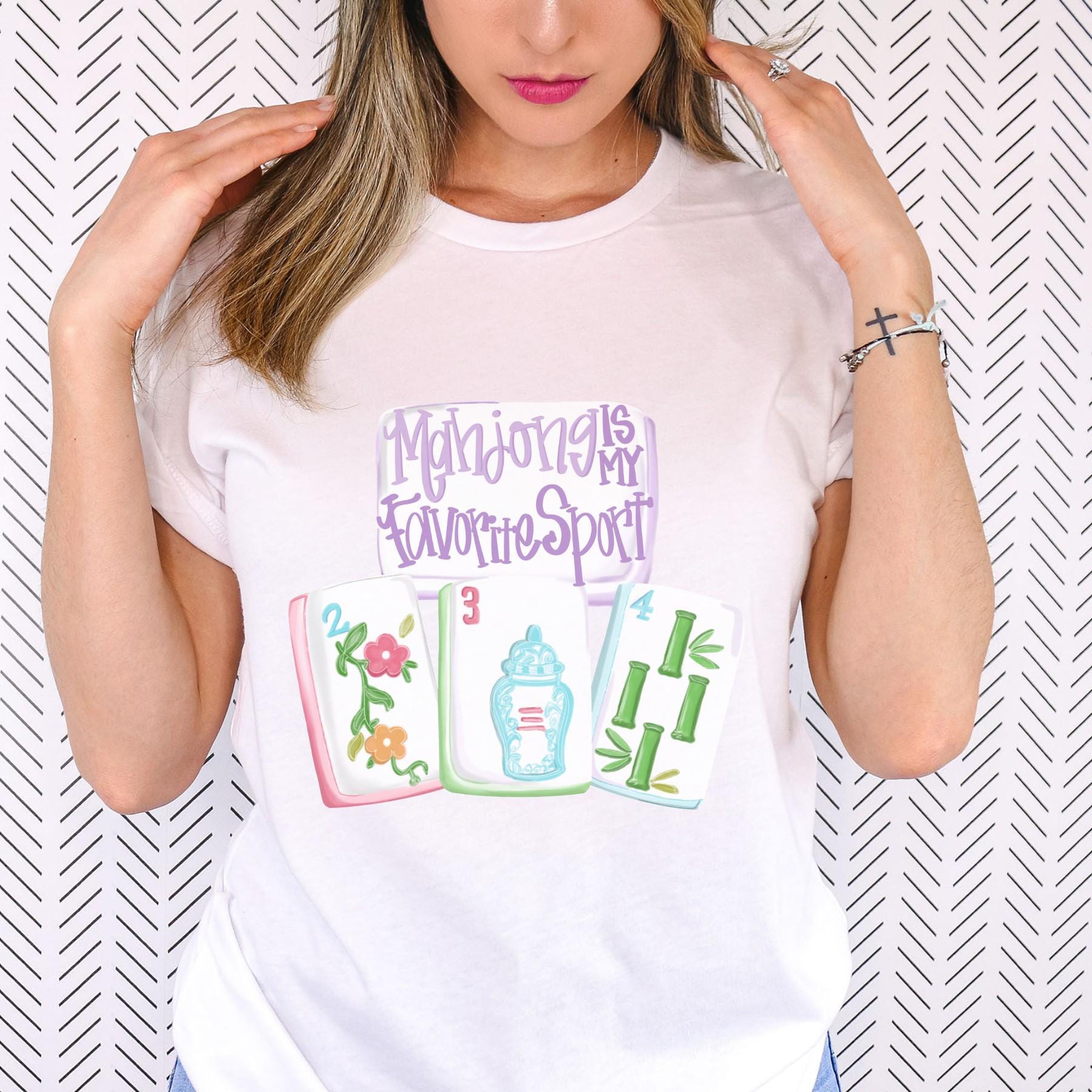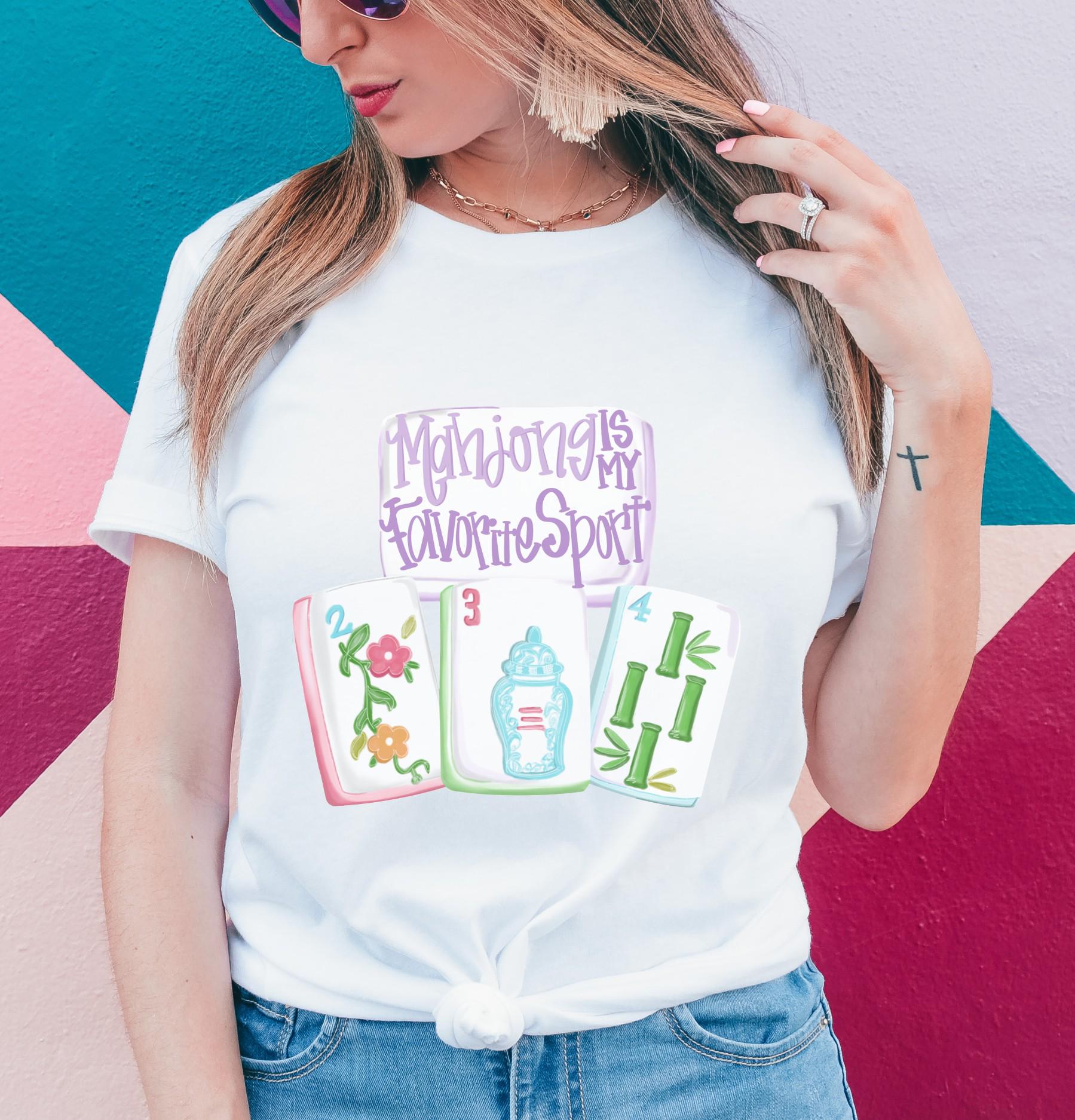 This cute and funny “Mahjong Is My Favorite Sport” tee proves it. Featuring spiring pastel colorful tile artwork and playful lettering, this design is printed using professional sublimation for a soft, vibrant finish.