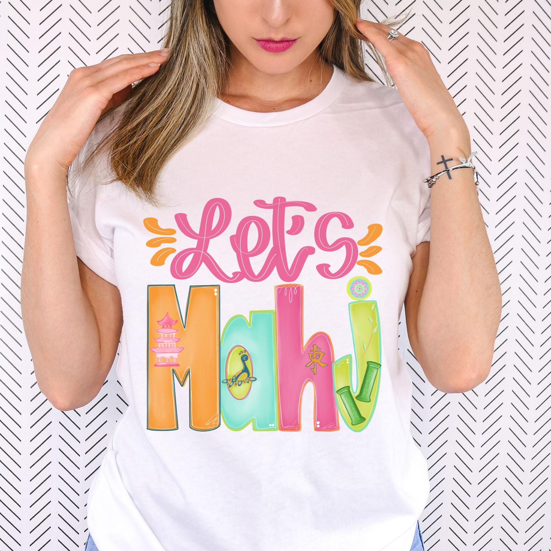 Let’s Mahj. For the players who live for league night, tournaments, and girls’ game weekends, this colorful “Let’s Mahj” design says it all. Featuring bold, tile-inspired lettering with bams, dots, and cracks details, this shirt is playful, vibrant, and instantly recognizable to real Mahjong lovers.
