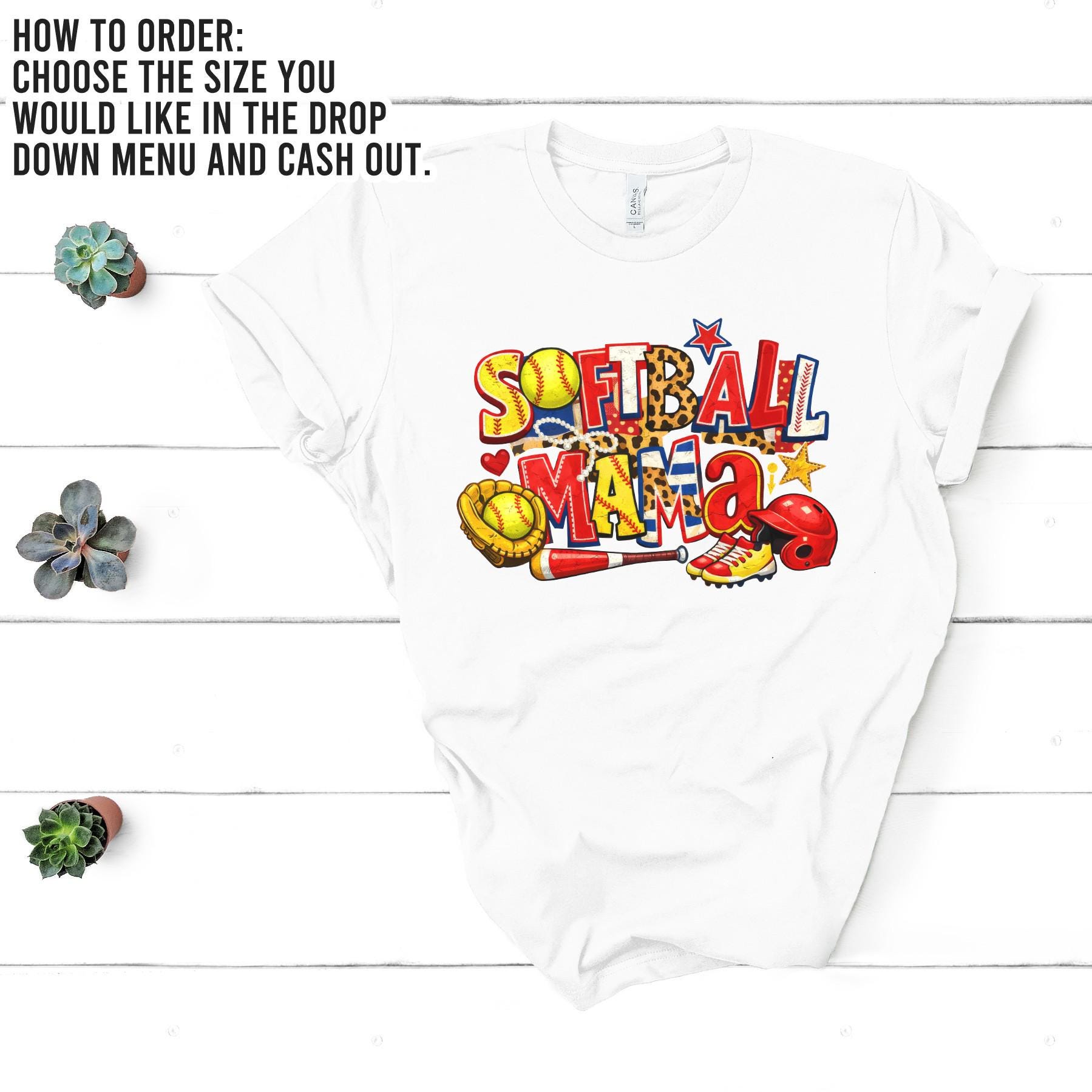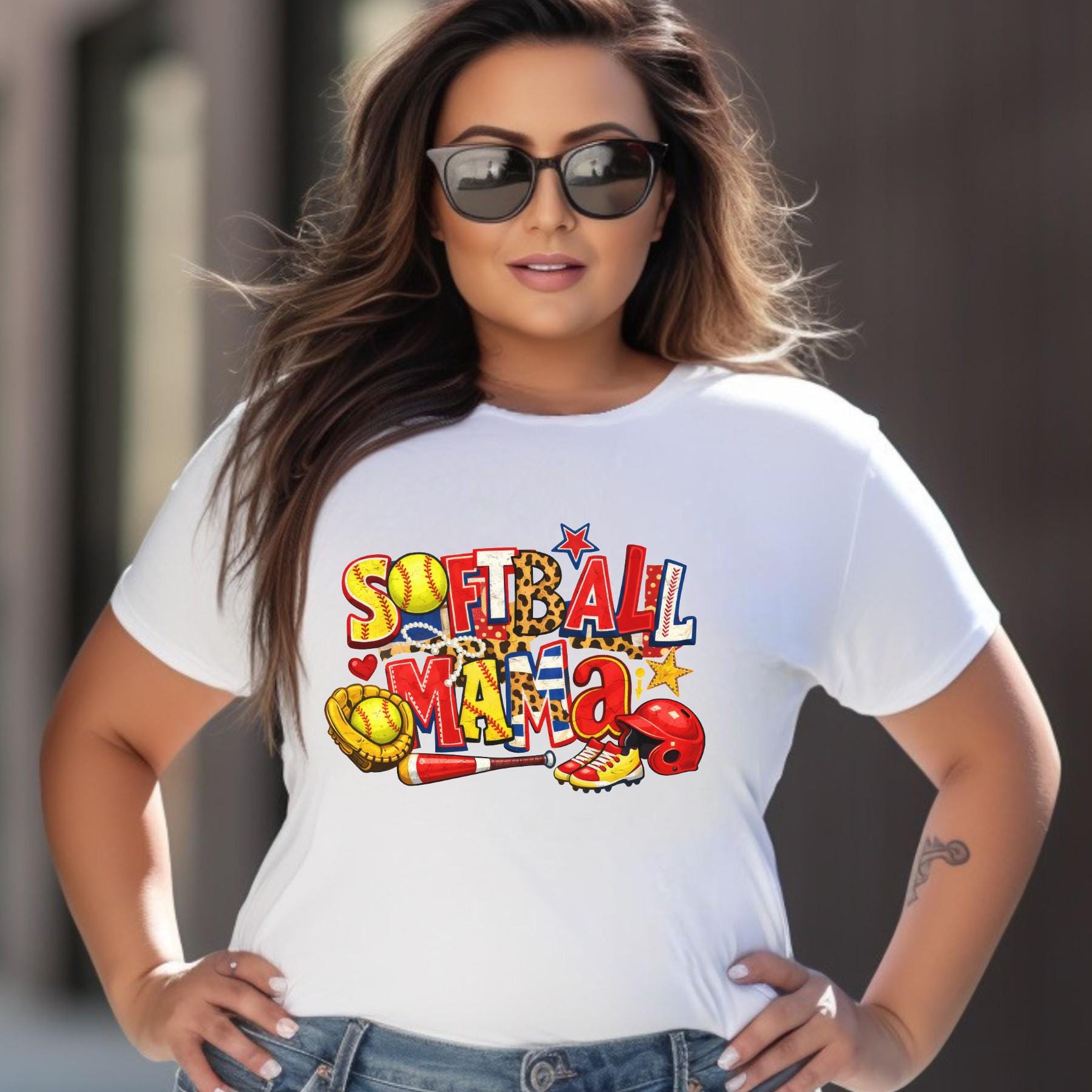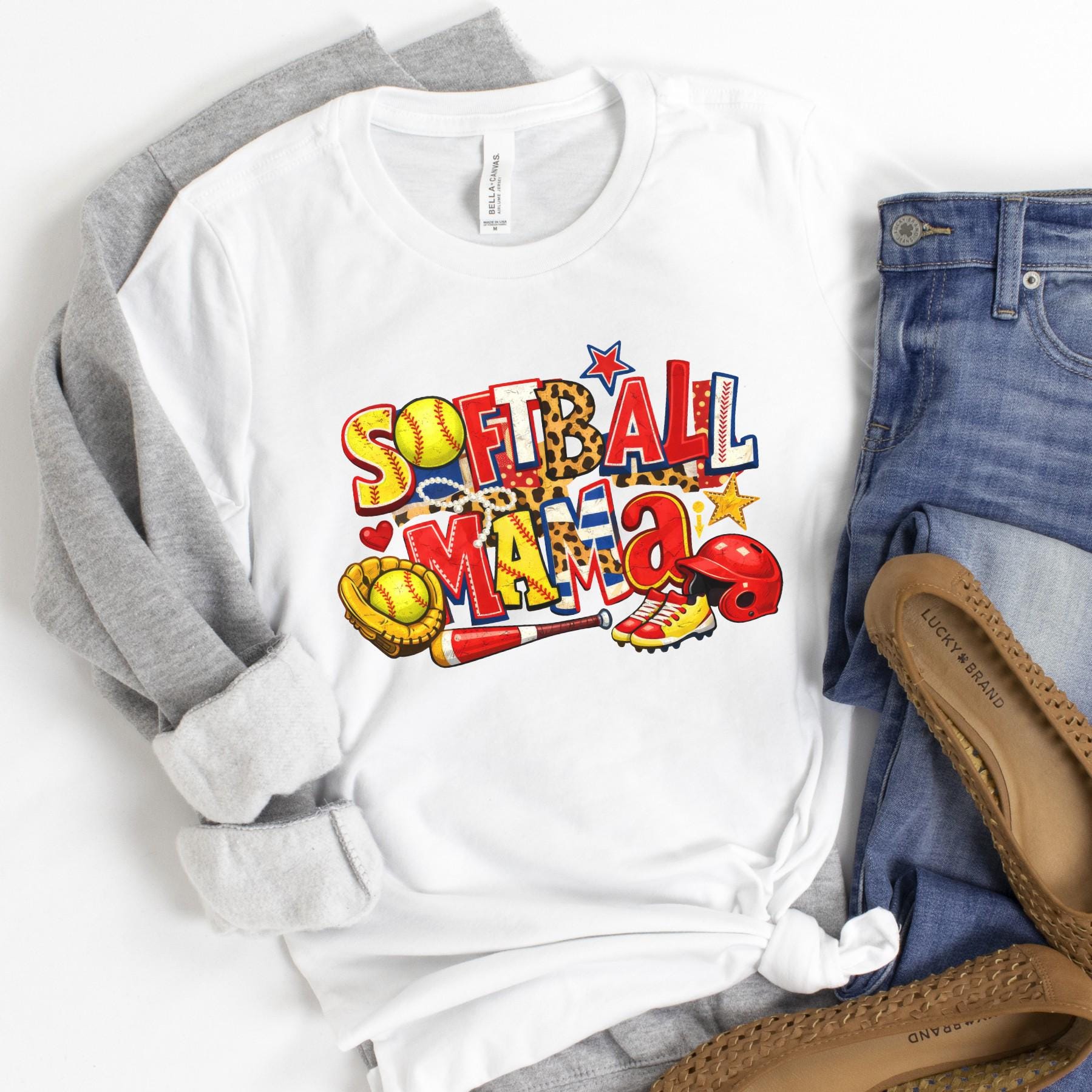 Show your softball pride with a bold and stylish twist. This Softball Mama graphic shirt features vibrant colors, playful leopard print accents, and pearl details for the perfect mix of sporty and glam. Surrounded by classic softball elements like a glove, bat, helmet, and ball, this design brings eye-catching personality to every game day outfit.