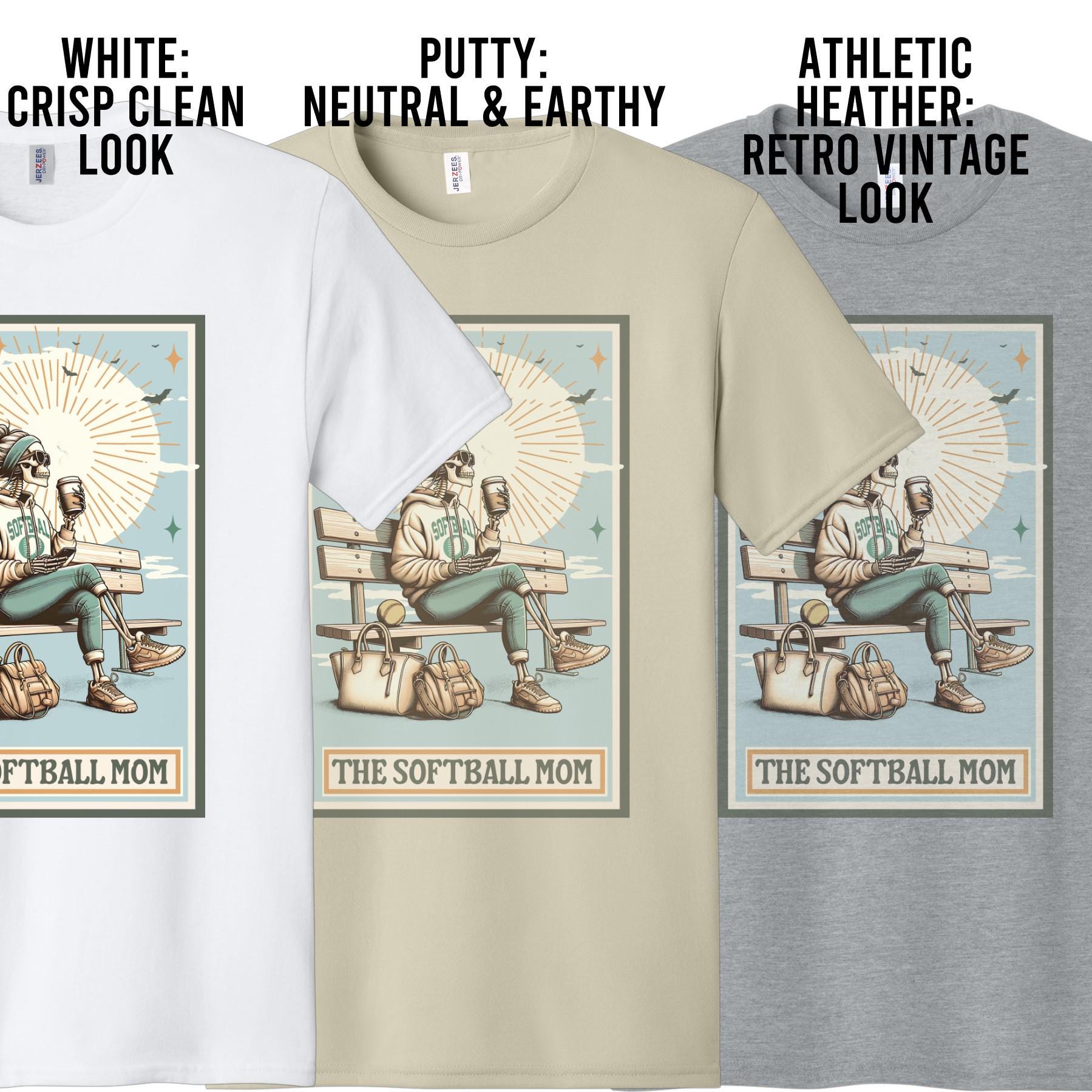 For the mom who practically lives at the ballfield—coffee in hand and always cheering loud. This vintage-inspired “Softball Mom” design features a relaxed bleacher scene in a tarot and Lotería-style layout for a bold, eye-catching look that stands out from typical spirit wear.