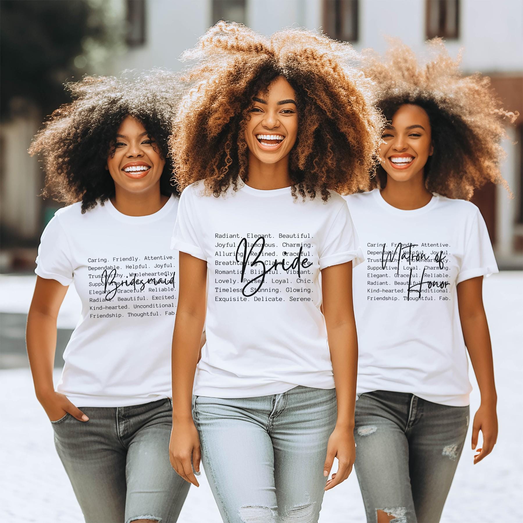 Celebrate your wedding crew in style with these modern word art bridal party shirts. Choose from four meaningful designs: Bride, Bridesmaid, Maid of Honor, and Matron of Honor—each featuring a collection of descriptive words paired with a bold script overlay.