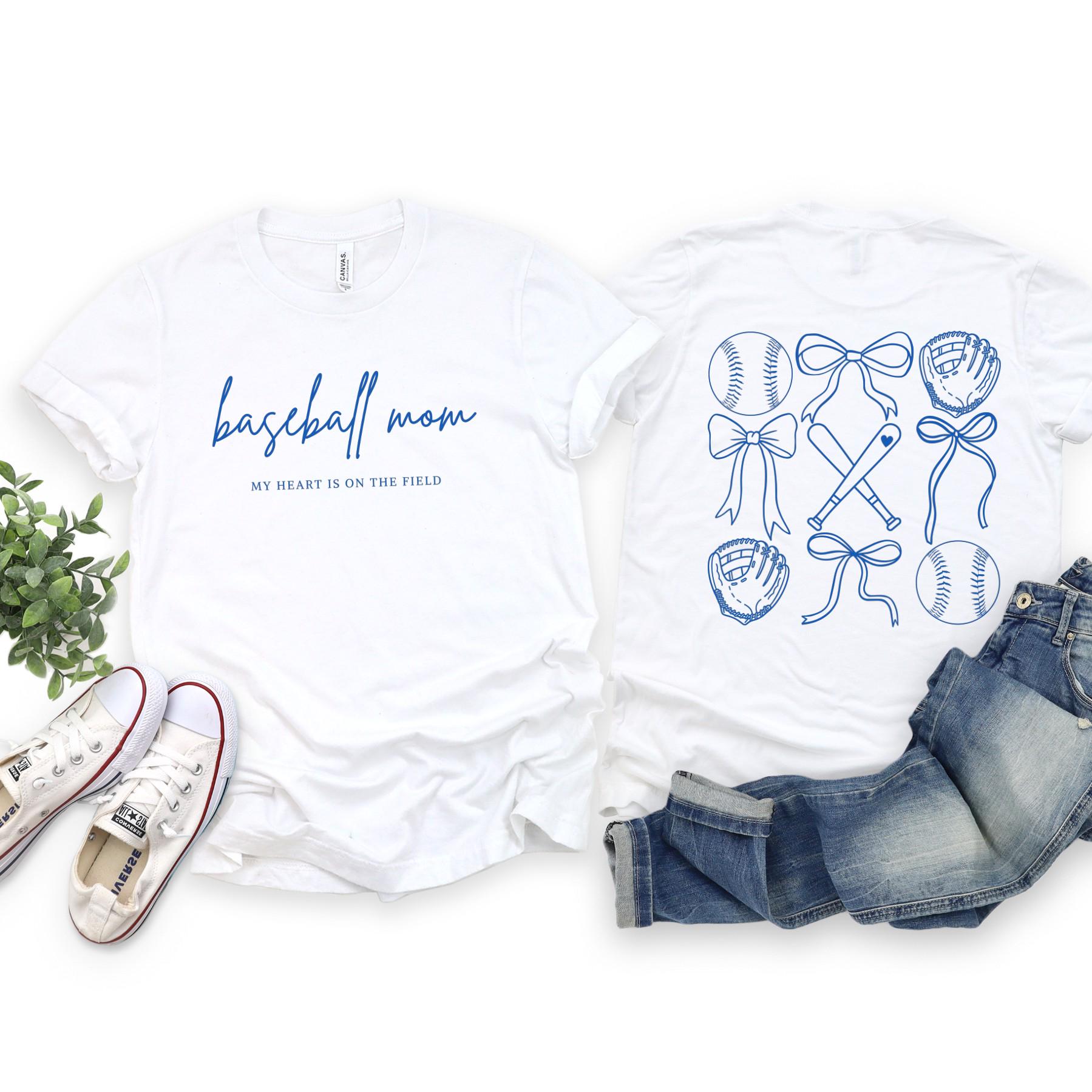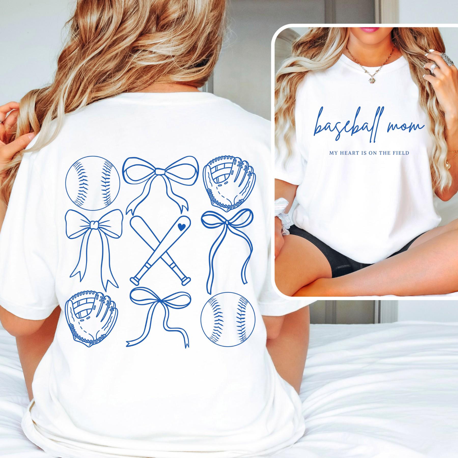 Show your softball pride with a clean, feminine twist. This blue “Baseball Mom” design features a stylish coquette-inspired look with bows and classic baseball elements, paired with the phrase “my heart is on the field” for a meaningful touch.